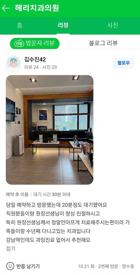 전체보기임플란트치아교정심미보철일반진료이용후기 BEFORE & AFTER 정말 안아프게 치료해 주시는 편이라, 가족들과 수년째 다니고 있어요~ 일반진료 작성자 강남헤리치과 작성일 2025-10-28 18:37 출처 : 네이버리뷰 https://naver.me/FA2FUvHD 좋아요 0 싫어요 0 인쇄 목록보기 이전 다음 Powered by KBoard